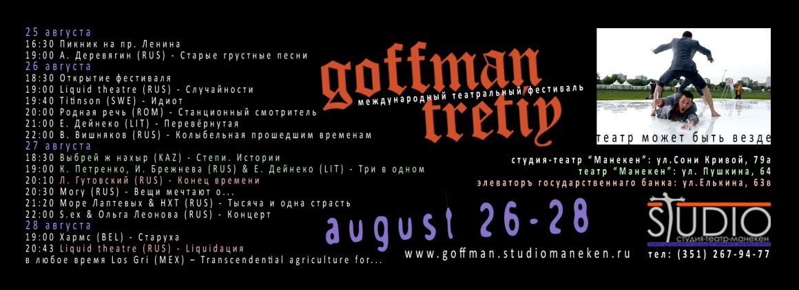 КонцепцияМеждународный фестиваль околотеатральной культуры "GOFFMAN" проводится в жанре site-specific, когда действие разворачивается в зависимости от идей и впечатлений, возникающих в каком-то конкретном пространстве. Можно сказать, что фестиваль никогда не заканчивается, а кочует из города в город, из страны в страну.